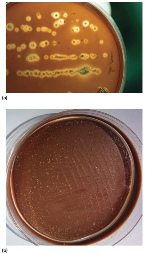 富集培养基: (a)人咽喉细菌血琼脂培养。(b)巧克力琼脂,一种用于培养苛养生物如淋病奈瑟菌富集培养基。棕色是加热红细胞并在添加到培养基前裂解结果。因其巧克力棕色而得名。