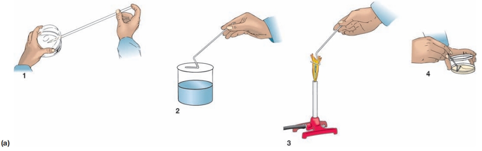(a)涂布平板制备:(1)将小样品移液至琼脂培养基平板中心。(2)将玻璃涂布器浸入乙醇烧杯。(3)短暂火焰消毒乙醇浸湿涂布器,让其冷却。(4)用消毒涂布器将样品均匀铺在琼脂表面。