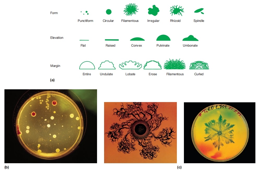 细菌菌落形态 (a)肉眼可见细菌菌落形态变化。菌落总体形状和边缘形状可通过从上往下看菌落顶部确定。菌落隆起性质在从侧面观察平板(持平板与眼睛平齐)时明显。(b)常观察到菌落形态示例。(c)菌落形态随细菌生长培养基显著变化。这些美丽雪花状菌落由枯草芽孢杆菌在营养贫瘠琼脂上形成。当面对不良生长条件时,细菌表现合作行为,结果常是类似于非生命系统中分形图案复杂结构。