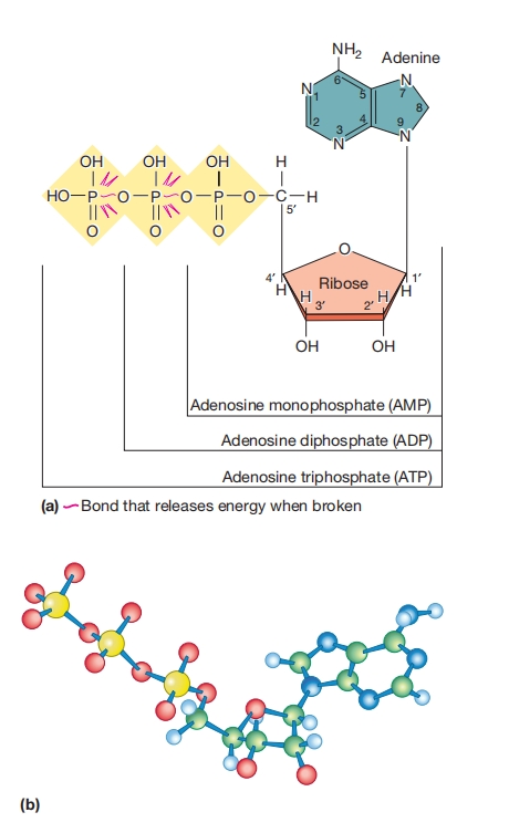 (a)ATP、ADP和AMP的结构。两条红色键更容易断裂或具有高磷酸基团转移势能(见正文)。
