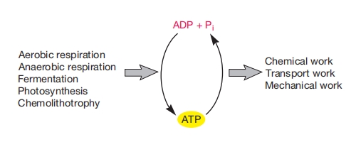 ATP由有氧呼吸、无氧呼吸、发酵、化能无机营养和光合作用过程中释放的能量形成。其分解为ADP和磷酸(Pi)使得化学功、运输功和机械功得以进行。