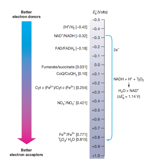 由于NAD+/NADH对的E0′相对较负,它比还原电位较不負(或更正)的氧化还原对储存更多的势能。 因此,当电子从供体移动到具有更正还原电位的受体时,会释放自由能。
