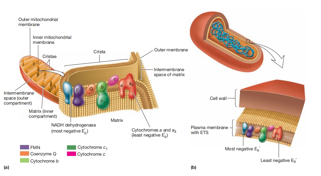 电子传递系统。 电子传递系统(ETS)位于膜中。在呼吸过程中(有氧呼吸、无氧呼吸和化能无机营养),电子从具有最负还原电位的电子载体流向具有最正还原电位的电子载体。